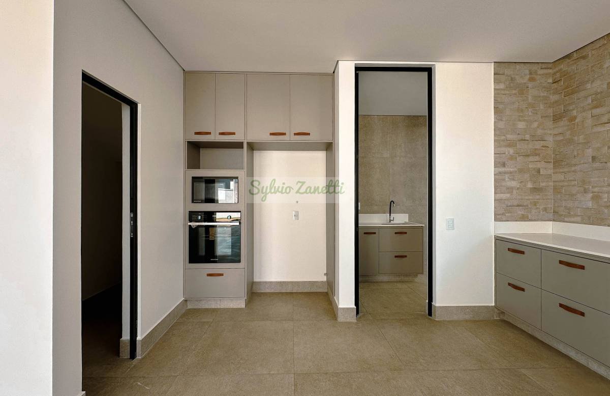 Área gourmet com fogão, cooktop, micro-ondas e forno elétrico