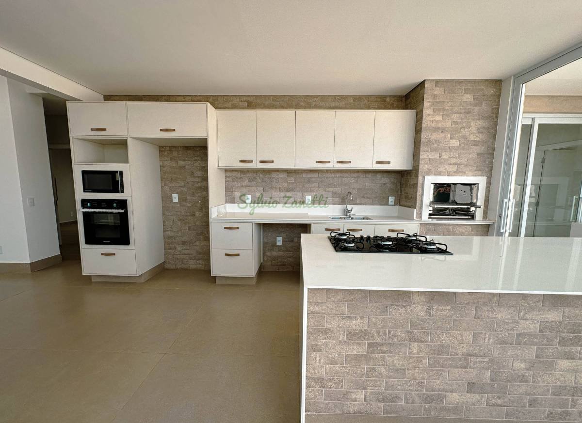 Área gourmet com fogão, cooktop, micro-ondas e forno elétrico